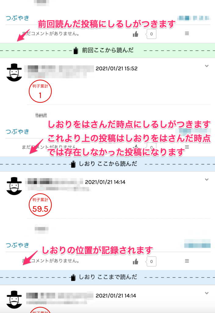 前回しおりをはさんだときに読み始めた投稿の位置が把握できるようになります。