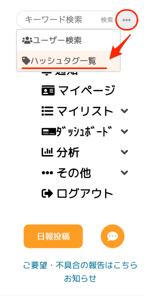 ■ハッシュタグ一覧ページ ハッシュタグの一覧を見ることができるページを作成しました。 ヘルプページはこちらです ハッシュタグ一覧ページには下記の画像を参考に、 画面左側のキーワード検索右「 …」->「ハッシュタグ一覧」から移動できます。 2021/03/12更新情報
