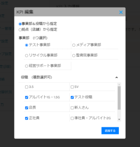 ④対象者は「事業部」に紐づいた「役職」または「拠点・店舗」から選択できます。